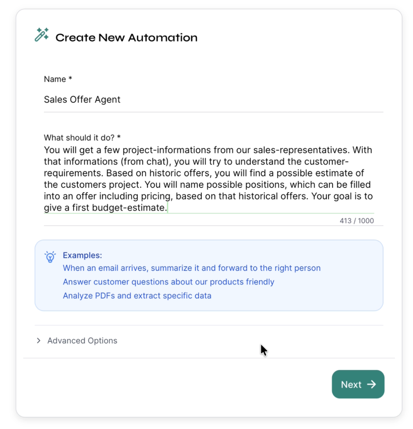 Beschreiben Sie Abläufe in Klartext, wählen Sie aus Templates oder starten Sie von Null. Der Editor setzt Regeln, Ausgaben und Übergaben automatisch zusammen – kein Code, kein Prompting.